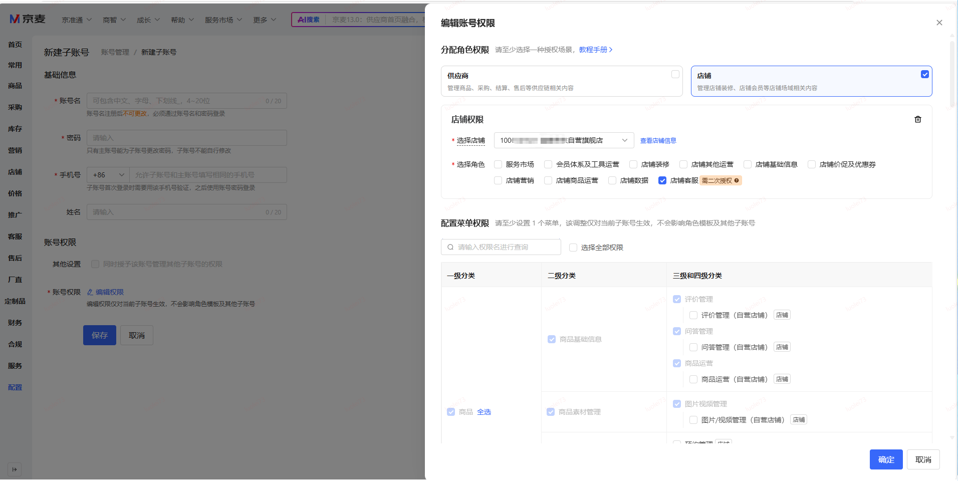 建账号时候先不要选择账号权限,等账号建好之后,再点击“编辑权限”,在权限配置页面可直接选择该账号要绑定到哪个店铺成为店铺账号,然后配置店铺客服权限。
