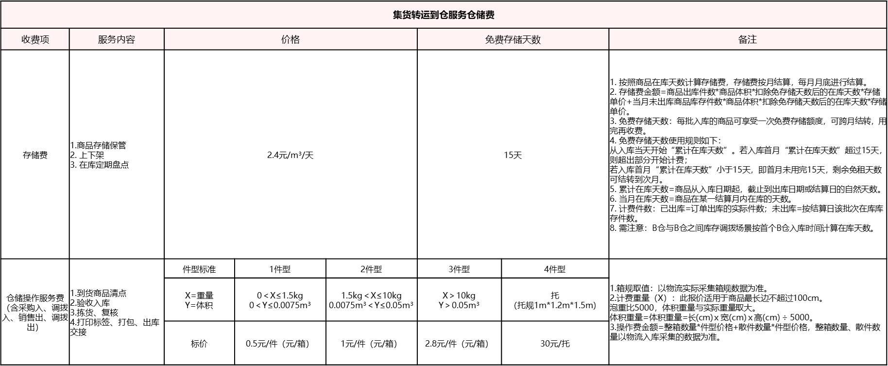 - 箱件标准:整箱入库的商品按整箱判断件型,收取XX元/箱;散件入库的商品按单个商品判断件型,收取XX元/件。