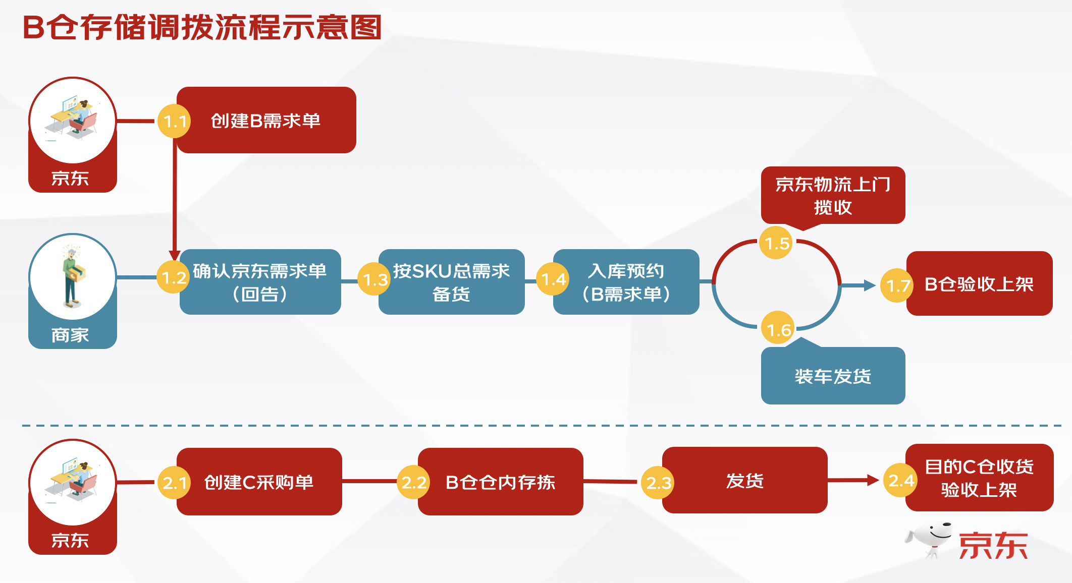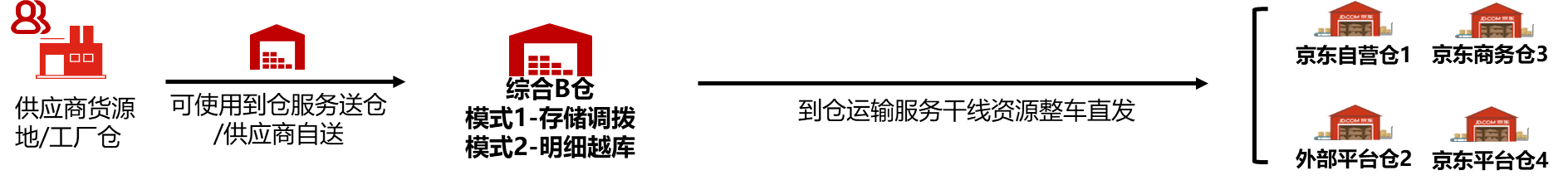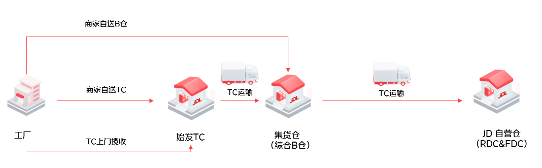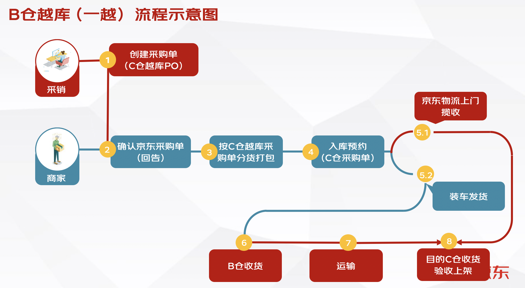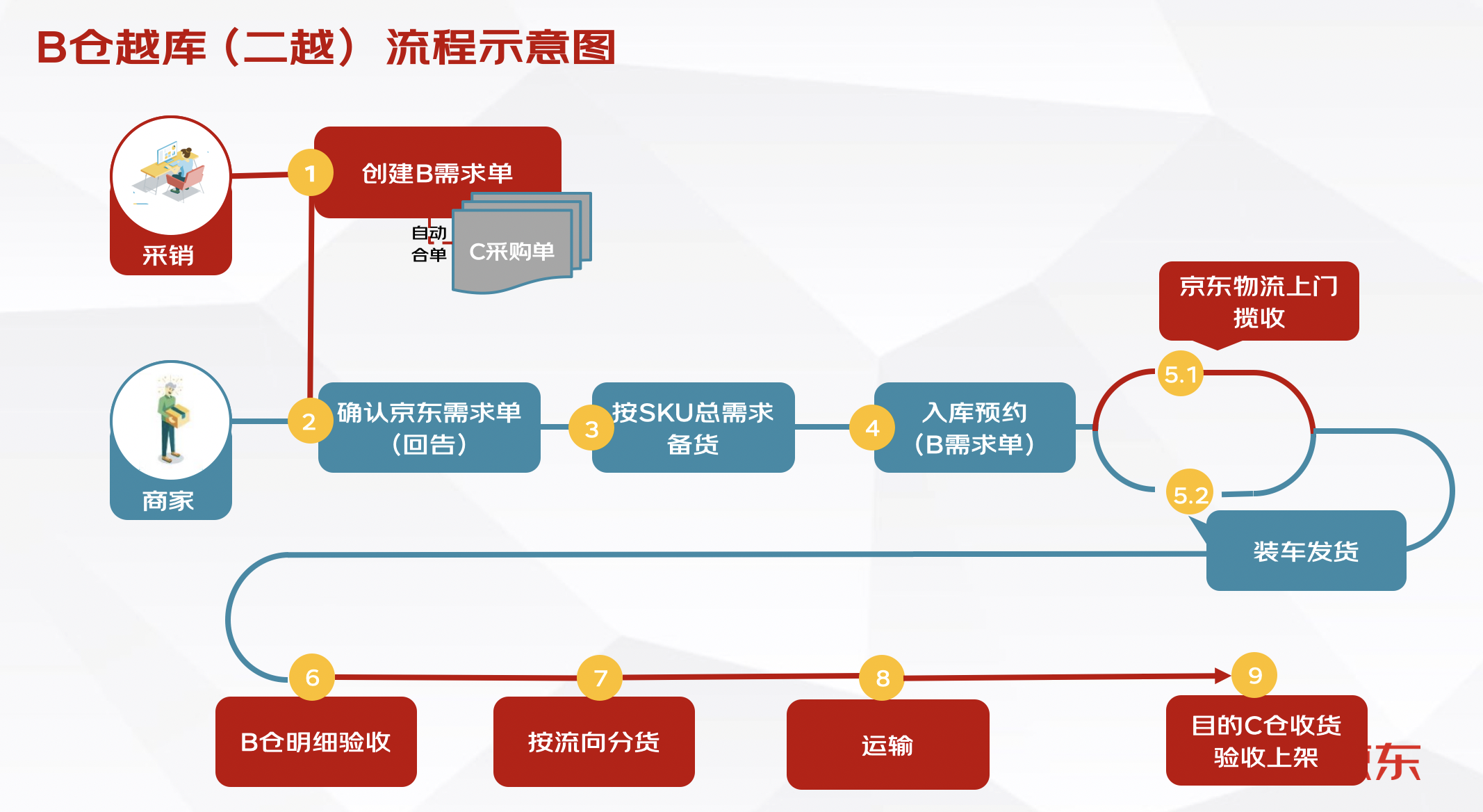 - 二越:商家按照SKU的总采购量自己送货至B仓(或使用京东物流上门揽收服务),B仓进行明细验收,由京东物流完成越库流向分货并转运至目的C仓,任何送仓货品差异商家和B仓对接处置。