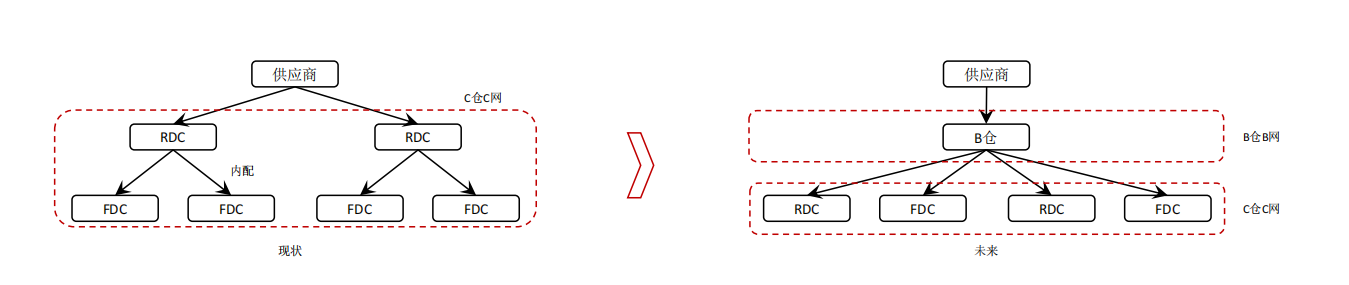 BBCC模式:将8个RDC大仓降级成与其他FDC小仓同级,一共有60+个,统称为C仓;然后又增加一些城市B仓,这个B仓可以理解为集货中转仓,这一个中转仓可以将货进行分拣后再分发运往全国这60+个C仓,商家只需要将货送到B仓就行,与猫超的集货仓模式类似。